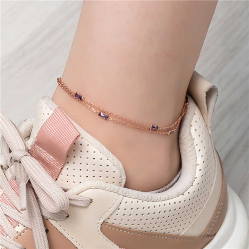Silver Rose Double Chain Square Lilac Stone AnkletAlthough jewelry usually comes to mind for women, it has influenced both men and women throughout history. Jewelry, worn by women to appear more elegant and attractive and by men for style, not only represents social status, personality, beliefs, and identity, but also has various functions. In Anatolia, women working in vineyards, gardens, and fields could easily find their young children's locations thanks to the sound made by anklets they wore on their feet. Anklets were also used to deter poisonous animals such as snakes and scorpions from approaching thanks to the sound they made. Today, they are worn by women who want to look elegant and stylish. Don't deprive your wrists of this elegance and visit our anklet section to choose your favorite model. The double chain square lilac stone anklet is made of 925 sterling silver. The silver is rose plated. Rose-plated women's anklets preserve their shine for a long time, transforming silver to rose gold and delaying oxidation. All of our products are handmade. Due to the silver and precious stones, there may be a ±10% deviation in product weight.Anklet Zircon Stone Width: 0.30 cmAnklet Zircon Stone Length: 0.50 cmAnklet Chain Length: 27 cmAverage Weight: 2.80 gr.