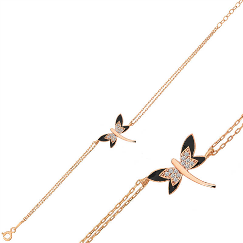 Silver Rose Dragonfly Women's Bracelet The dragonfly is the symbol of devotion, loyalty and monogamy... The dragonfly does not give up on its love despite death... By nature, after the male and female dragonfly mate, the male dragonfly dies. Even knowing that death will eventually come, the male dragonfly mates with a single female throughout its life and never gives up... The bracelet was designed with inspiration from this beauty that smells of sadness and loyalty... This elegant bracelet is a wonderful bracelet that can be preferred as a birthday gift, Valentine's Day gift or on special occasions. This stylish design is made of 925 sterling silver. Rose gold plated on silver. Rose gold plated bracelets preserve their shine for a long time, turn the silver color to pink and delay oxidation. The stones on the bracelet are zircon. Like all women's silver bracelets, the silver dragonfly women's bracelet is also handmade. Due to silver and precious stones, there may be a ± 10% deviation in the specified product weight. Width: 1.80 cm Length: 2.00 cm Chain Length: 19.00 cm Average Weight: 1.60 gr.