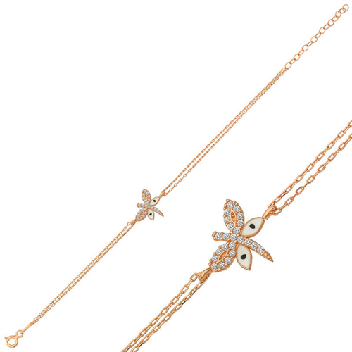 Silver Rose Dragonfly Women's Bracelet The dragonfly is the symbol of devotion, loyalty and monogamy... The dragonfly does not give up on its love despite death... By nature, after the male and female dragonfly mate, the male dragonfly dies. Even knowing that death will eventually come, the male dragonfly mates with a single female throughout its life and never gives up... The bracelet was designed with inspiration from this beauty that smells of sadness and loyalty... This elegant bracelet is a wonderful bracelet that can be preferred as a birthday gift, Valentine's Day gift or on special occasions. This stylish design is made of 925 sterling silver. Rose plated on silver. Rose plated bracelets preserve their shine for a long time and delay oxidation. The stones on the bracelet are zircon. Like all women's silver bracelets, the silver dragonfly women's bracelet is also handmade. Due to silver and precious stones, there may be ± 10% deviation in the specified product weight. Width: 1.60 cm Length: 1.30 cm Chain Length: 19.00 cm Average Weight: 1.70 gr.