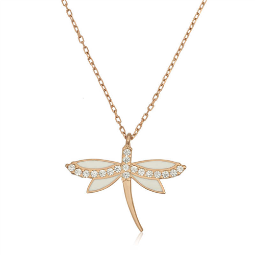 Silver Rose Dragonfly Women's Necklace The dragonfly is the symbol of devotion, loyalty and monogamy... The dragonfly does not give up on its love despite death... By nature, after the male and female dragonfly mate, the male dragonfly dies. Even knowing that death will eventually come, the male dragonfly mates with a single female throughout its life and never gives up... The necklace was designed with inspiration from this beauty that smells of sadness and loyalty... This elegant necklace is a wonderful necklace that can be preferred as a birthday gift, Valentine's Day gift or on special occasions. This stylish design is made of 925 sterling silver. Rose plated on silver. Rose plated necklaces preserve their shine for a long time, turning the silver color into pink. The stones on the necklace are zircon. Like all women's silver necklaces, the silver dragonfly women's necklace is produced by hand. Due to silver and precious stones, there may be a ± 10% deviation in the specified product weight. Width: 2.20 cm Length: 1.90 cm Chain Length: 45.00 cm Average Weight: 1.70 gr.