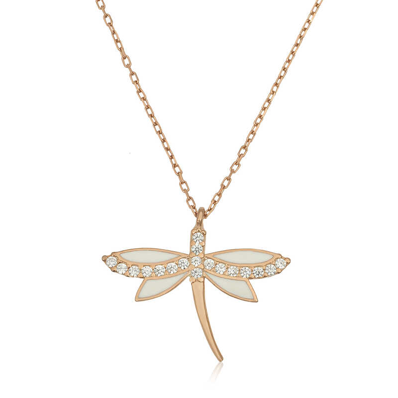 Silver Rose Dragonfly Women's Necklace The dragonfly is the symbol of devotion, loyalty and monogamy... The dragonfly does not give up on its love despite death... By nature, after the male and female dragonfly mate, the male dragonfly dies. Even knowing that death will eventually come, the male dragonfly mates with a single female throughout its life and never gives up... The necklace was designed with inspiration from this beauty that smells of sadness and loyalty... This elegant necklace is a wonderful necklace that can be preferred as a birthday gift, Valentine's Day gift or on special occasions. This stylish design is made of 925 sterling silver. Rose plated on silver. Rose plated necklaces preserve their shine for a long time, turning the silver color into pink. The stones on the necklace are zircon. Like all women's silver necklaces, the silver dragonfly women's necklace is produced by hand. Due to silver and precious stones, there may be a ± 10% deviation in the specified product weight. Width: 2.20 cm Length: 1.90 cm Chain Length: 45.00 cm Average Weight: 1.70 gr.