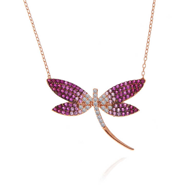 Silver Rose Dragonfly Women's Necklace The dragonfly is the symbol of devotion, loyalty, and monogamy... The dragonfly does not give up on its love despite death... By nature, after the male and female dragonfly mate, the male dragonfly dies. Even knowing that death will eventually come, the male dragonfly mates with a single female throughout its life and never gives up... The necklace was designed with inspiration from this beauty that smells of sadness and loyalty... This elegant necklace is a wonderful necklace that can be preferred as a birthday gift, Valentine's Day gift or on special occasions. This stylish design is made of 925 sterling silver. Rose plated on silver. Rose plated necklaces preserve their shine for a long time, turning the silver color into pink. The stones on the necklace are zircon. Like all women's silver necklaces, the silver dragonfly women's necklace is produced by hand. Due to silver and precious stones, there may be ± 10% deviation in the specified product weight. Width: 2.90 cm Length: 2.00 cm Chain Length: 45.00 cm Average Weight: 3 gr.