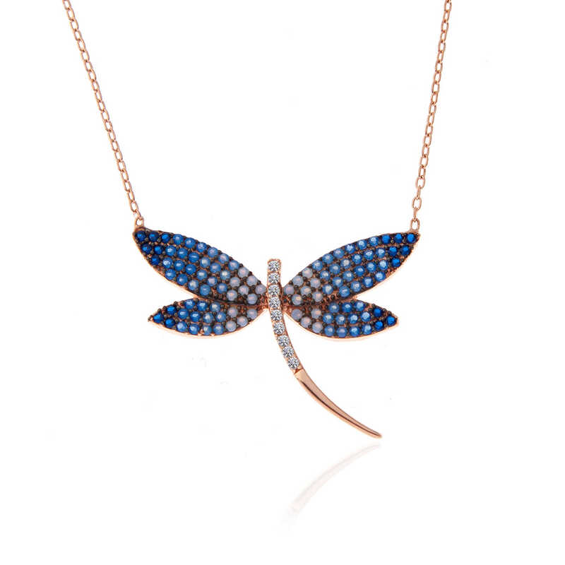 Silver Rose Dragonfly Women's Necklace The dragonfly is the symbol of devotion, loyalty, and monogamy... The dragonfly does not give up on its love despite death... By nature, after the male and female dragonfly mate, the male dragonfly dies. Even knowing that death will eventually come, the male dragonfly mates with a single female throughout its life and never gives up... The necklace was designed with inspiration from this beauty that smells of sadness and loyalty... This elegant necklace is a wonderful necklace that can be preferred as a birthday gift, Valentine's Day gift or on special occasions. This stylish design is made of 925 sterling silver. Rose plated on silver. Rose plated necklaces preserve their shine for a long time, turning the silver color into pink. The stones on the necklace are zircon. Like all women's silver necklaces, the silver dragonfly women's necklace is produced by hand. Due to silver and precious stones, there may be ± 10% deviation in the specified product weight. Width: 2.90 cm Length: 2.00 cm Chain Length: 45.00 cm Average Weight: 3.00 gr.