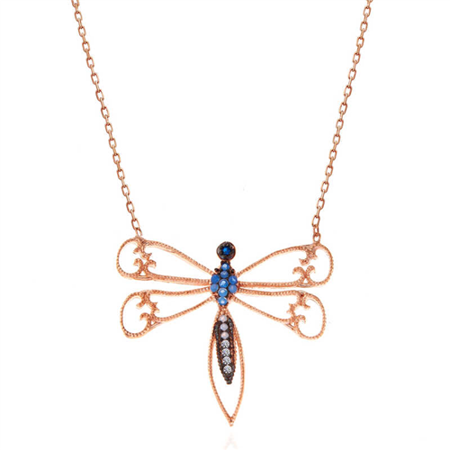 Silver Rose Dragonfly Women's Necklace The dragonfly is the symbol of devotion, loyalty, and monogamy... The dragonfly does not give up on its love despite death... By nature, after the male and female dragonfly mate, the male dragonfly dies. Even knowing that death will eventually come, the male dragonfly mates with a single female throughout its life and never gives up... The necklace was designed with inspiration from this beauty that smells of sadness and loyalty... This elegant necklace is a wonderful necklace that can be preferred as a birthday gift, Valentine's Day gift or on special occasions. This stylish design is made of 925 sterling silver. Rose plated on silver. Rose plated necklaces preserve their shine for a long time, turning the silver color into pink. The stones on the necklace are zircon. Like all women's silver necklaces, the silver dragonfly women's necklace is produced by hand. Due to silver and precious stones, there may be ± 10% deviation in the specified product weight. Width: 2.80 cm Length: 2.70 cm Chain Length: 45.00 cm Average Weight: 2.70 gr.