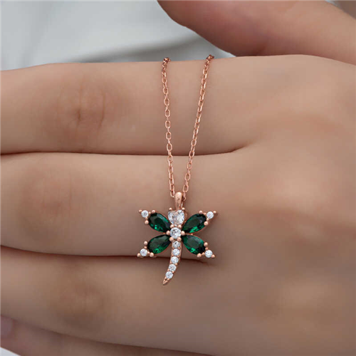 Silver Rose Dragonfly Women's Necklace The dragonfly is the symbol of devotion, loyalty, and monogamy... The dragonfly does not give up on its love despite death... By nature, after the male and female dragonfly mate, the male dragonfly dies. Even knowing that death will eventually come, the male dragonfly mates with a single female throughout its life and never gives up... The necklace was designed with inspiration from this beauty that smells of sadness and loyalty... This elegant necklace is a wonderful necklace that can be preferred as a birthday gift, Valentine's Day gift or on special occasions. This stylish design is made of 925 sterling silver. Rose plated on silver. Rose plated necklaces preserve their shine for a long time, turning the silver color into pink. The stones on the necklace are zircon. Like all women's silver necklaces, the silver dragonfly women's necklace is produced by hand. Due to silver and precious stones, there may be a ± 10% deviation in the specified product weight. Width: 1.50 cm Length: 1.70 cm Chain Length: 45.00 cm Average Weight: 2.40 gr.