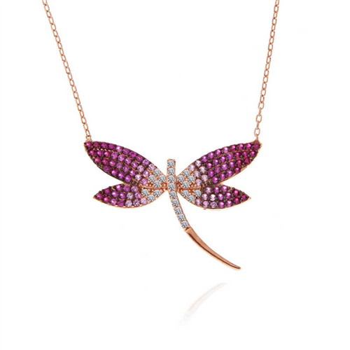 Silver Rose Dragonfly Women's Necklace The dragonfly is the symbol of devotion, loyalty, and monogamy... The dragonfly does not give up on its love despite death... By nature, after the male and female dragonfly mate, the male dragonfly dies. Even knowing that death will eventually come, the male dragonfly mates with a single female throughout its life and never gives up... The necklace was designed with inspiration from this beauty that smells of sadness and loyalty... This elegant necklace is a wonderful necklace that can be preferred as a birthday gift, Valentine's Day gift or on special occasions. This stylish design is made of 925 sterling silver. Rose plated on silver. Rose plated necklaces preserve their shine for a long time, turning the silver color into pink. The stones on the necklace are zircon. Like all women's silver necklaces, the silver dragonfly women's necklace is produced by hand. Due to silver and precious stones, there may be ± 10% deviation in the specified product weight. Width: 2.90 cm Length: 2.00 cm Chain Length: 45.00 cm Average Weight: 3 gr.