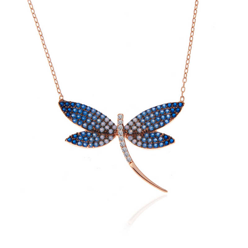 Silver Rose Dragonfly Women's Necklace The dragonfly is the symbol of devotion, loyalty, and monogamy... The dragonfly does not give up on its love despite death... By nature, after the male and female dragonfly mate, the male dragonfly dies. Even knowing that death will eventually come, the male dragonfly mates with a single female throughout its life and never gives up... The necklace was designed with inspiration from this beauty that smells of sadness and loyalty... This elegant necklace is a wonderful necklace that can be preferred as a birthday gift, Valentine's Day gift or on special occasions. This stylish design is made of 925 sterling silver. Rose plated on silver. Rose plated necklaces preserve their shine for a long time, turning the silver color into pink. The stones on the necklace are zircon. Like all women's silver necklaces, the silver dragonfly women's necklace is produced by hand. Due to silver and precious stones, there may be ± 10% deviation in the specified product weight. Width: 2.90 cm Length: 2.00 cm Chain Length: 45.00 cm Average Weight: 3.00 gr.