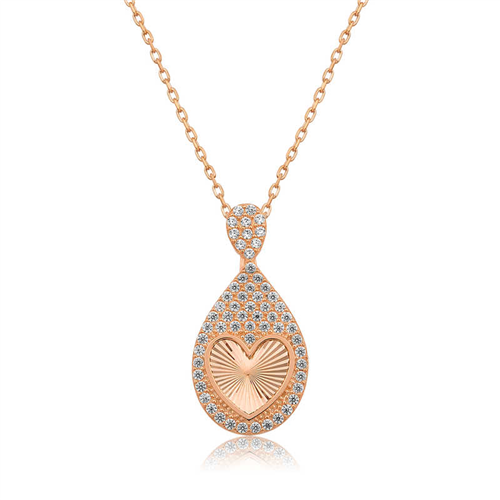 Silver Rose Drop Heart Women's Necklace The heart symbol has always been the symbol of unconditional love and affection. In religious teachings, the power of the heart is limitless. Because the heart is the home of the Creator and our gateway to reality that opens to the universe. The silver drop heart necklace is one of the most stylish and meaningful necklaces that will represent you and your lover. This stylish drop heart women's necklace is a perfect option for a birthday gift, Valentine's Day gift or a gift for mothers on special occasions. Silver zircon stone drop heart women's necklace is made of 925 sterling silver. This necklace is rose plated. Rose plated silver drop heart women's necklace models preserve their shine for a long time. The stones on it are zircon. Like all silver women's necklace models, the silver drop heart women's necklace model is produced by hand. Due to silver and precious stones, there may be ± 10% deviation in the average product weight. Width: 1.10 cm Length: 2.30 cm Average Weight: 2.44 gr Chain Length: 45.00 cm
