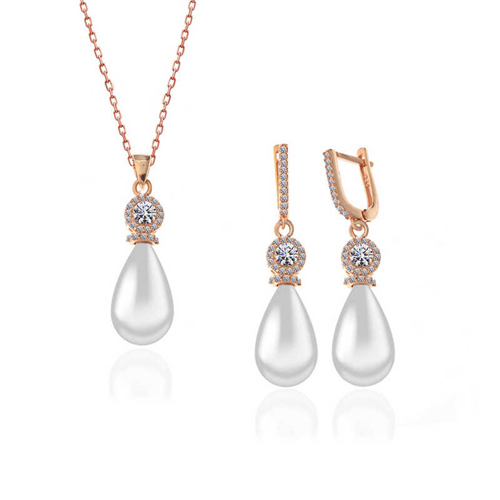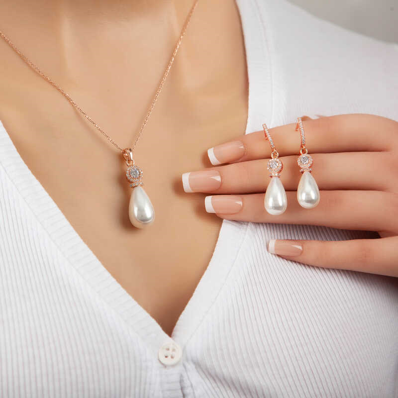 Silver Rose Drop Pearl Women's SetPearl symbolizes simplicity and humility. Although it looks plain, it actually means being very precious. Pearl is the best way to express your love and feelings for your lover. It is the symbol of shine, light, enlightenment and hope. How about making your feelings felt on the skin of the woman you love with the silver drop pearl set, which every woman should have among her accessories and which will never go out of style... It is made of 925 sterling silver. Rose plated on silver. Rose plated silver pearl sets preserve their shine for a long time and delay oxidation. The stone on it is a cultured pearl. The average chain length is 45 cm. All of our products are handmade. Due to silver and precious stones, there may be ± 10% deviation from the average product weight.Earring Width: 1.00 cm.Earring Length: 4.40 cm.Necklace Width: 1.00 cm.Necklace Length: 3.40 cm.Chain Length: 45 cm.Average Weight: 14.20 gr.
