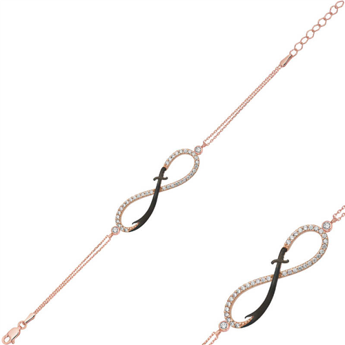 Silver Rose Infinity Zulfiqar Sword Women's BraceletOne of the most beautiful, most meaningful ways to express eternal love to your loved one is to gift her infinity-themed silver jewelry. With this special bracelet model that you will gift your loved one, you can express your eternal love and give the message that you will be together forever. The infinity zulfiqar women's bracelet model is made of 925 sterling silver. Rose gold plated on silver. Rose gold plated silver women's necklace models preserve their shine for a long time and oxidation is delayed. The white stones on the necklace are zircon. The average length of the silver chain is 19 cm. Like all silver women's bracelet models, the silver infinity zulfiqar sword women's bracelet model is also handmade. Due to silver and precious stones, there may be a ± 10% deviation in the average product weight.Width: 1.00 cmLength: 3.00 cmAverage Weight: 3.25 gr.