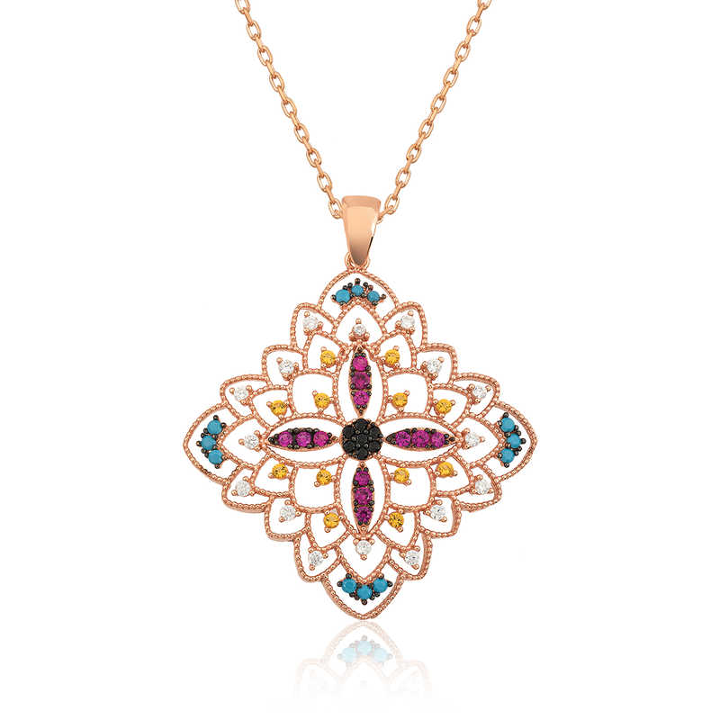 Silver Rose Ethnic Patterned Medallion Necklace The ethnic patterned medallion necklace, adorned with colored zircon stones, is designed for those who love elegance and shine. It is a product that you can enjoy using at any time of the day, that will attract everyone's admiration and dazzle. Silver ethnic patterned medallion women's necklace is made of 925 sterling silver. Rose plating is applied to this necklace. Rose plating preserves its shine for a long time and turns silver into copper color. The stones on it are zircon. Like all silver women's necklace models, the silver ethnic patterned medallion women's necklace model is also produced by hand. Due to silver and precious stones, there may be a ± 10% deviation in the average product weight. All of our products are produced by hand. Width: 3.50 cm Length: 3.50 cm Average Weight: 8.00 gr.