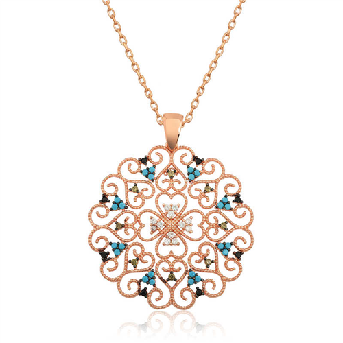 Silver Rose Ethnic Patterned Medallion NecklaceThe ethnic patterned medallion necklace, adorned with colored zircon stones, is designed for those who love style and shine. It is a product that you can enjoy using at any time of the day, that will attract everyone's attention and dazzle. Silver ethnic patterned medallion women's necklace is made of 925 sterling silver. This necklace is rose gold plated. Rose gold plated products preserve their shine for a long time and turn silver into copper color. The stones on it are zircon. Like all silver women's necklace models, the silver ethnic patterned medallion women's necklace model is also produced by hand. Due to silver and precious stones, there may be a ± 10% deviation in the average product weight. All of our products are produced by hand.Width: 3.30 cm Length: 3.30 cm Average Weight: 6.00 gr.