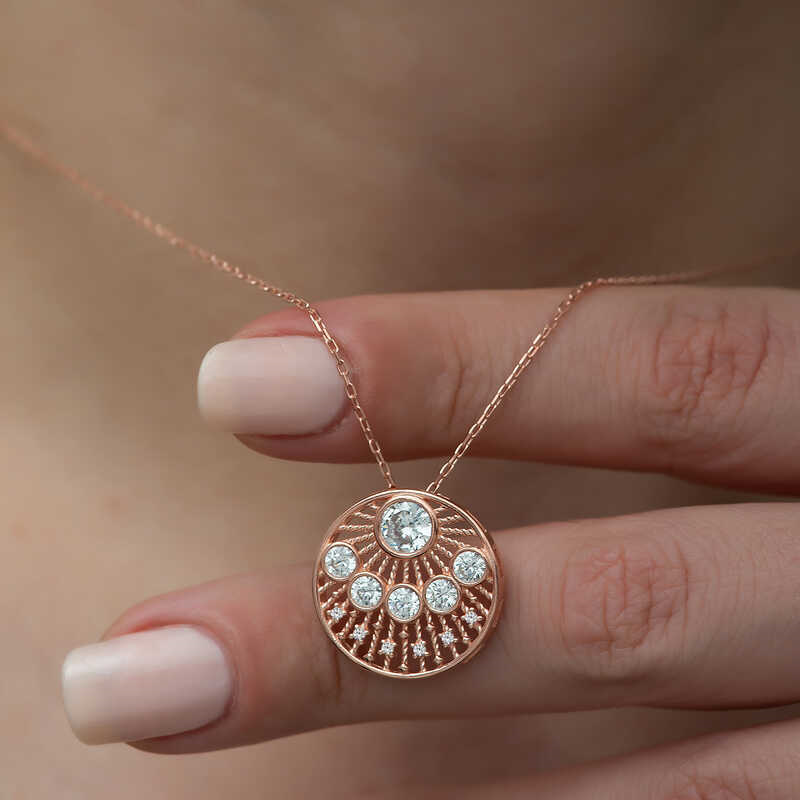Silver Rose Ethnic Patterned Women's Necklace The ethnic patterned women's necklace, adorned with white zircon stones, is designed for those who love elegance and shine. It is a product that you can enjoy using at any time of the day, that will attract everyone's attention and dazzle. The silver ethnic patterned women's necklace is made of 925 sterling silver. This necklace is plated with rose gold. Rose gold-plated products preserve their shine for a long time and turn the silver into copper color. The stones on it are zircon. Like all silver women's necklace models, the silver ethnic patterned women's necklace model is also produced by hand. Due to silver and precious stones, there may be a ± 10% deviation in the average product weight. All of our products are produced by hand. Width: 1.80 cm Length: 1.80 cm Average Weight: 3.35 gr.
