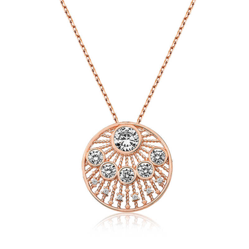 Silver Rose Ethnic Patterned Women's Necklace The ethnic patterned women's necklace, adorned with white zircon stones, is designed for those who love elegance and shine. It is a product that you can enjoy using at any time of the day, that will attract everyone's attention and dazzle. The silver ethnic patterned women's necklace is made of 925 sterling silver. This necklace is plated with rose gold. Rose gold-plated products preserve their shine for a long time and turn the silver into copper color. The stones on it are zircon. Like all silver women's necklace models, the silver ethnic patterned women's necklace model is also produced by hand. Due to silver and precious stones, there may be a ± 10% deviation in the average product weight. All of our products are produced by hand. Width: 1.80 cm Length: 1.80 cm Average Weight: 3.35 gr.