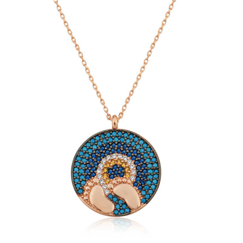 Silver Rose Evil Eye Footprint Women's Necklace The genetic makeup of every baby is different. So much so that each individual's handprint and footprint are unique... There is no other. Let the baby footprint, designed with inspiration from this romantic reality, find a mark in your heart... This wonderful necklace is a perfect option for a birthday gift, Valentine's Day gift or a gift for mothers on special occasions. This stylish design is made of 925 sterling silver. This necklace is rose plated. Rose plated necklaces preserve their shine for a long time and turn the silver color into pink. Like all silver women's necklaces, the silver evil eye footprint women's necklace is also handmade. Due to silver and precious stones, there may be a ± 10% deviation in the specified product weight. Width: 2.00 cm Length: 2.00 cm Average Weight: 3.50 gr.