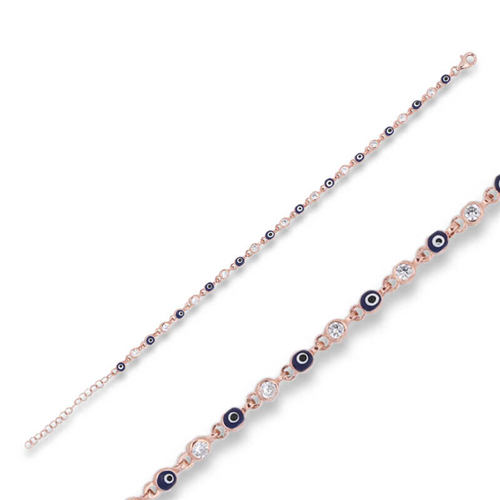 Silver Rose Evil Eye Beaded BraceletPeople have used the evil eye bead for many years to protect themselves from evil looks. It is a precaution against the negative effects of evil looks on people, the evil eye bead… For this reason, people wear the evil eye bead to protect their loved ones. This evil eye bead bracelet reflects elegance and style. You can choose this model, which has always been popular and does not compromise on its elegance, as a birthday gift, Valentine's Day gift or a gift for mothers on special occasions. The silver evil eye women's bracelet is made of 925 sterling silver. Rose plated silver. Rose plated silver women's bracelets preserve their shine for a long time and oxidation is delayed. The stones on it are zircon. Like all silver women's bracelets, this silver evil eye bead women's bracelet model is entirely handmade. Due to silver and precious stones, there may be a ± 10% deviation in the average product weight.Width: 0.40 cmLength: 0.40 cmAverage Weight: 4.30 gr.Chain length: 19.00 cm