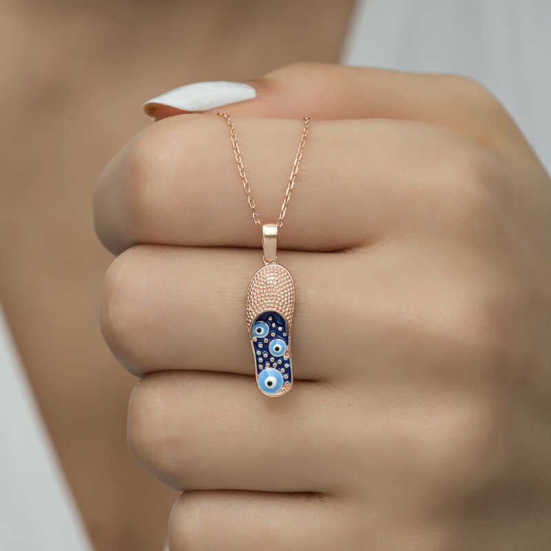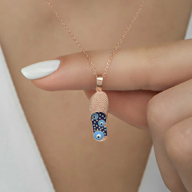 Silver Rose Evil Eye Covered Slippers Women's Necklace Evil eye beads have been used for many years to protect against evil gazes. The evil eye bead is a precaution against the negative effects of evil gazes on people. For this reason, people wear evil eye beads to protect their loved ones. This evil eye covered slippers women's necklace reflects elegance and style. You can choose this model, which has always been popular and does not compromise on its elegance, as a birthday gift, Valentine's Day gift or a gift for mothers on special occasions. The silver evil eye covered slippers women's necklace is made of 925 sterling silver. Rose plated silver. Rose plated silver women's necklaces preserve their shine for a long time and oxidation is delayed. Like all silver women's necklaces, this silver evil eye covered slippers women's necklace model is produced entirely by hand. Due to silver and precious stones, there may be a ± 10% deviation in the average product weight. Necklace Width: 0.80 cm Necklace Length: 2.60 cm Chain Length: 45 cm Average Weight: 3.00 gr.