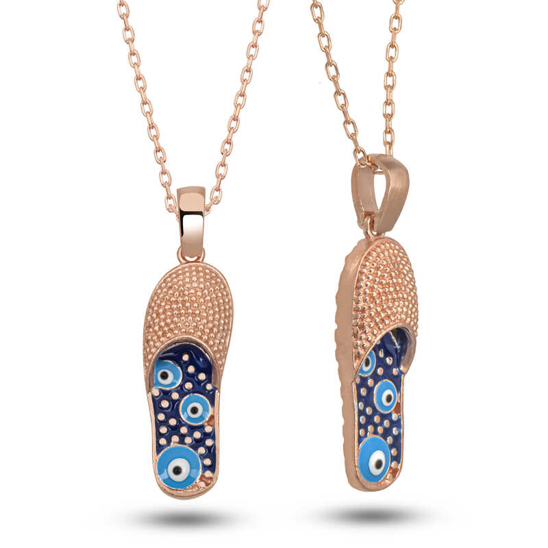 Silver Rose Evil Eye Covered Slippers Women's Necklace Evil eye beads have been used for many years to protect against evil gazes. The evil eye bead is a precaution against the negative effects of evil gazes on people. For this reason, people wear evil eye beads to protect their loved ones. This evil eye covered slippers women's necklace reflects elegance and style. You can choose this model, which has always been popular and does not compromise on its elegance, as a birthday gift, Valentine's Day gift or a gift for mothers on special occasions. The silver evil eye covered slippers women's necklace is made of 925 sterling silver. Rose plated silver. Rose plated silver women's necklaces preserve their shine for a long time and oxidation is delayed. Like all silver women's necklaces, this silver evil eye covered slippers women's necklace model is produced entirely by hand. Due to silver and precious stones, there may be a ± 10% deviation in the average product weight. Necklace Width: 0.80 cm Necklace Length: 2.60 cm Chain Length: 45 cm Average Weight: 3.00 gr.
