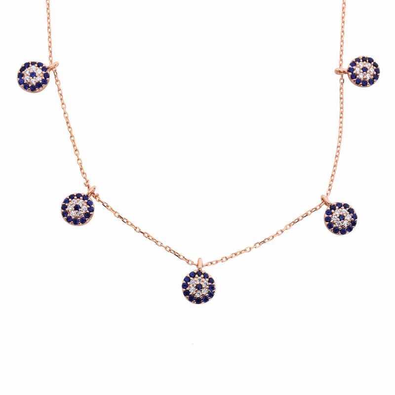 Silver Rose Evil Eye Luck Necklace for Women The silver evil eye bead is a model that you can easily use in daily life with its simple design. The evil eye bead protects you from evil eyes. The stones on this stylish silver necklace model are zircon. Rose plated silver is used to delay oxidation and preserve its shine for a long time. The average chain length, which is completely silver, is 45 cm. This evil eye luck necklace model is handmade. Due to silver and precious stones, there may be ± 10% deviation from the average product weight. Width: 0.70 cm Length: 0.70 cm Average weight: 3.50 gr