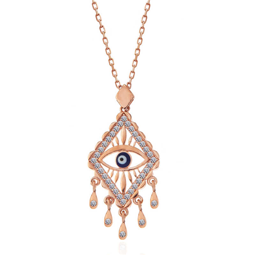 Silver Rose Evil Eye Necklace Various talismans have been used in many cultures to protect against the harms of bad energy. The talisman used in most Eastern cultures is the eye. The evil eye bead is also designed with inspiration from the shape of the eye. The choice of blue color is no coincidence. Evil eye beads are mostly designed in blue due to the belief that people with colored eyes reflect their energy more effectively. You can gift the dazzling silver evil eye necklace to those you want to protect from the evil eye and to your loved ones. The silver necklace is rose plated. Rose plated silver women's necklaces preserve their shine for a long time and oxidation is delayed. The average silver chain length is 45 cm. All of our products are handmade. Due to silver and precious stones, there may be ± 10% deviation in product weight. Width: 1.50 cm Length: 3.00 cm Chain Length: 45.00 cm Avg. Weight: 2.90 gr