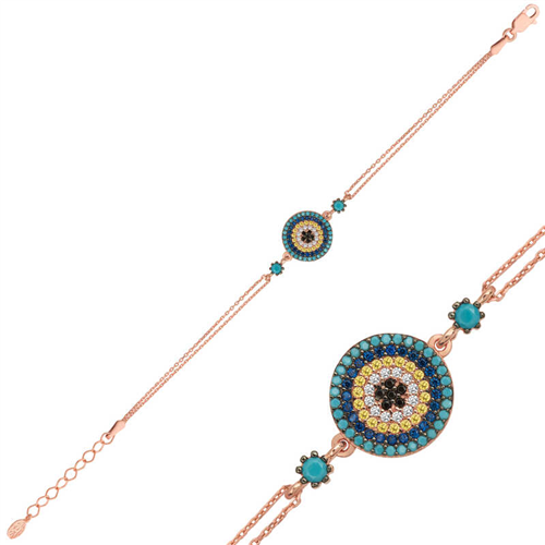 Silver Rose Evil Eye Women's BraceletFor many years, people have used the evil eye bead to ward off evil gazes. The evil eye bead is a precaution against the negative effects of evil gazes on people. For this reason, people wear the evil eye bead to protect their loved ones. This evil eye bracelet reflects elegance and style. You can choose this model, which has always been popular and does not compromise on its elegance, as a birthday gift, Valentine's Day gift, or a gift for mothers on special occasions. The rose evil eye women's bracelet is made of 925 sterling silver. Rose plating is applied to the silver. Rose plating women's bracelets preserve their shine for a long time, turns the silver color to pink, and delays oxidation. The stones on the bracelet are zircon. Like all silver women's bracelet models, this silver rose evil eye women's bracelet is produced entirely by hand. Due to silver and precious stones, there may be a ± 10% deviation in the average product weight.Width: 1.40 cmLength: 1.40 cmBracelet length: 20 cmAverage Weight: 3.7 gr.
