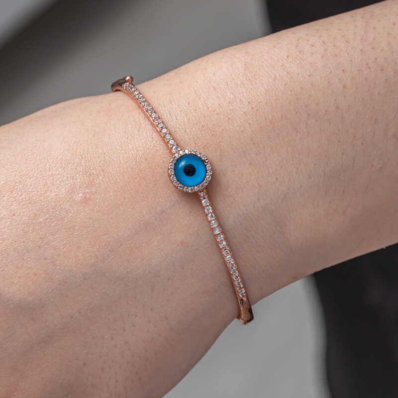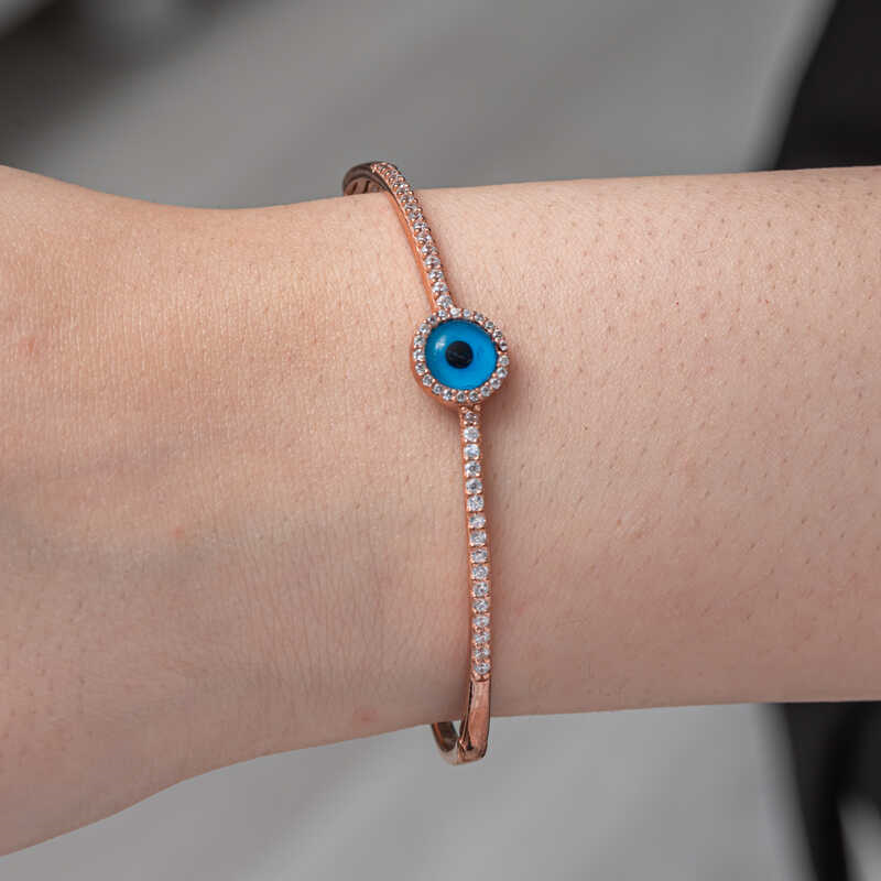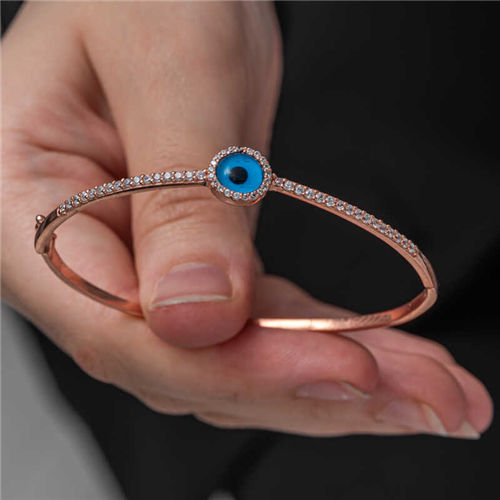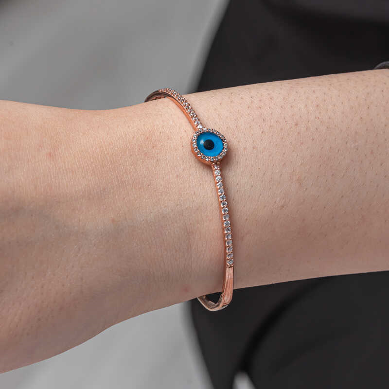 Silver Rose Evil Eye Women's BraceletIt is an ideal option for women who love a chic and fantasy look. In the collections; the evil eye bracelet awaits you with a model suitable for every taste and concept for women who pursue showiness and elegance. You can choose this stylish model as a birthday gift or Valentine's Day gift on special occasions. Silver evil eye women's bracelet is made of 925 sterling silver. Rose plated silver. Rose plated silver women's bracelets preserve their shine for a long time and oxidation is delayed. The stones on it are zircon. As with all silver women's bracelets, this silver evil eye women's bracelet model is also handmade. Due to silver and precious stones, there may be ± 10% deviation in the average product weight. Evil Eye Bracelet Diameter: 0.90 cmBracelet Diameter: 6 cmAverage Weight: 6.50 gr.