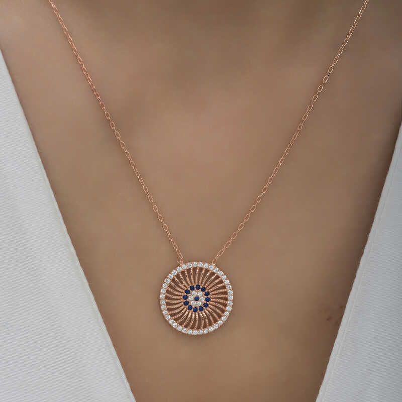 Silver Rose Evil Eye Women's Necklace Various talismans have been used in many cultures to protect against the harms of bad energy. The talisman used in most Eastern cultures is the eye. The evil eye bead is also inspired by the shape of the eye. The choice of blue color is no coincidence. Evil eye beads are mostly designed in blue due to the belief that people with colored eyes reflect their energy more effectively. You can gift this evil eye necklace to people you dazzle with its beauty and to your loved ones who you want to protect from the evil eye. The evil eye women's necklace model is made of 925 sterling silver. Rose plated silver. Rose plated silver evil eye necklace models preserve their shine for a long time and oxidation is delayed. The stones on the necklace are zircon. This evil eye women's necklace model is handmade like all other silver women's necklace models. Due to silver and precious stones, there may be a ± 10% deviation in the average product weight. Necklace Diameter: 1.70 cm Average Weight: 2.60 gr.