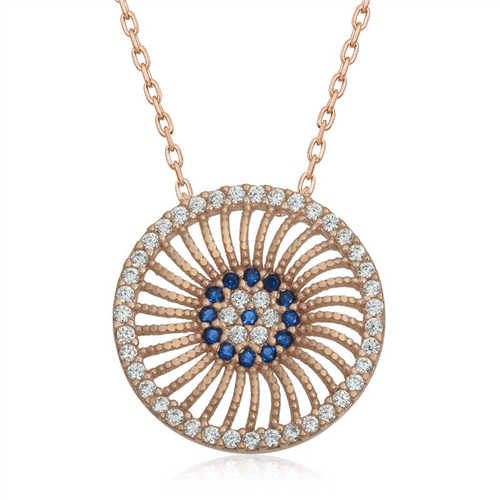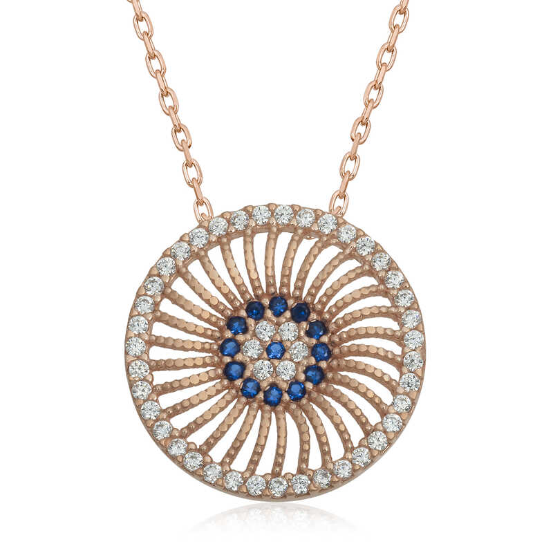 Silver Rose Evil Eye Women's Necklace Various talismans have been used in many cultures to protect against the harms of bad energy. The talisman used in most Eastern cultures is the eye. The evil eye bead is also inspired by the shape of the eye. The choice of blue color is no coincidence. Evil eye beads are mostly designed in blue due to the belief that people with colored eyes reflect their energy more effectively. You can gift this evil eye necklace to people you dazzle with its beauty and to your loved ones who you want to protect from the evil eye. The evil eye women's necklace model is made of 925 sterling silver. Rose plated silver. Rose plated silver evil eye necklace models preserve their shine for a long time and oxidation is delayed. The stones on the necklace are zircon. This evil eye women's necklace model is handmade like all other silver women's necklace models. Due to silver and precious stones, there may be a ± 10% deviation in the average product weight. Necklace Diameter: 1.70 cm Average Weight: 2.60 gr.