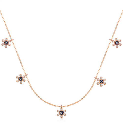 Silver Rose Flower Evil Eye Luck Women's Necklace The most special and elegant way to express your feelings to your loved ones is to send her stylish, colorful and fragrant flowers. Flowers, which are among the gifts to be given on special occasions, have been designed with a different interpretation this time. The flower necklace is waiting for those who want to express their love once again, for those who want to say you are a flower. This specially designed flower evil eye luck women's necklace is made of 925 sterling silver. Rose plated silver. Rose plated silver women's necklace models preserve their shine for a long time and oxidation is delayed. The stones on the necklace are zircon. Like all women's silver necklace models, the silver flower evil eye luck women's necklace is also handmade. Due to silver and precious stones, there may be a ± 10% deviation in the specified product weight. Width: 0.60 cm Length: 0.60 cm Average weight: 2.60 gr