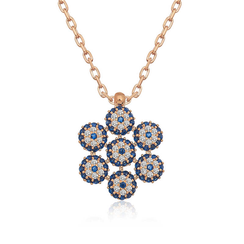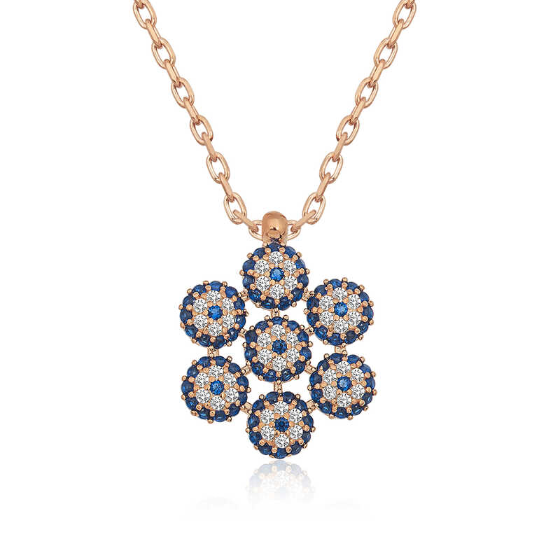 Silver Rose Flower Model Evil Eye Necklace Various talismans have been used in many cultures to protect against the harms of bad energy. The talisman used in most Eastern cultures is the eye. The evil eye bead is also inspired by the shape of the eye. The choice of blue color is no coincidence. Due to the belief that evil eye beads reflect the energy of people with colored eyes more effectively, they are mostly designed in blue. Dazzling with its beauty, you can gift this flower-patterned evil eye necklace to those you want to protect from the evil eye, as well as to your loved ones. The chain of this zircon-studded evil eye necklace is made of 925 sterling silver. The silver is rose-plated. Rose-plated silver evil eye necklaces retain their shine for a long time and slow oxidation. This flower-patterned evil eye necklace, like all our other silver necklaces, is handmade. Due to silver and precious stones, there may be ± 10% deviation from the average product weight. Width: 0.80 cm Height: 0.80 cm Average weight: 2.70 gr.