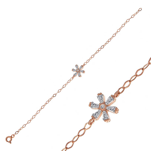Silver Rose Flower Women's Bracelet The most special and elegant way to express your feelings to your loved ones is to send them stylish, colorful and fragrant flowers. Flowers, which are among the gifts to be given on special occasions, this time found meaning with a silver bracelet. Crafted with the highest quality, brightest, and most sparkling stones, the silver flower women's bracelet is waiting for those who want to express their love once again, for those who want to say "you are a flower." This specially designed white flower women's bracelet is made of 925 sterling silver. Rose plated on silver. Rose plated silver bracelets preserve their shine for a long time and oxidation is delayed. Like all women's silver bracelets, the silver white flower women's bracelet is produced by hand. Due to silver and precious stones, there may be ± 10% deviation in the specified product weight. Bracelet Flower Width: 0.90 cm Bracelet Flower Length: 0.90 cm Chain Length: 19 cm Average Weight: 1.20 gr.