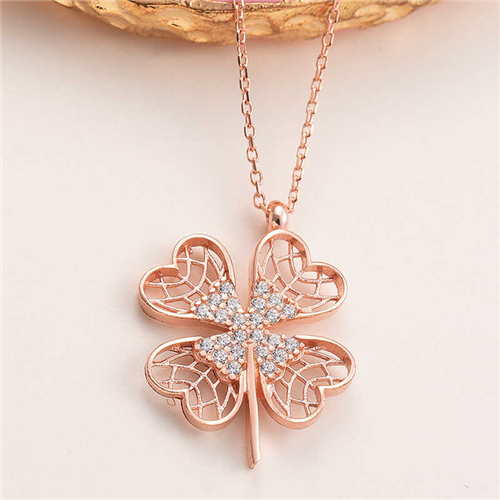 Silver Rose Four-Leaf Clover Women's Necklace The four-leaf clover is considered a symbol of good luck in all cultures. The first leaf symbolizes hope, the second faith, the third love, and the fourth leaf luck. This fourth leaf is very rare in nature. You can gift this meaningful necklace to the person you love and care about. This stylish necklace model is made of 925 sterling silver. Rose plating is applied to the silver. Rose-plated silver women's necklace models preserve their shine for a long time and oxidation is delayed. The silver chain on the necklace is 45 cm. Like all silver necklace models, the silver four-leaf clover necklace model is also produced entirely by hand. Due to silver and precious stones, there may be a ± 10% deviation from the average product weight. Width: 1.50 cm Length: 2.00 cm Average Weight: 1.70 gr.