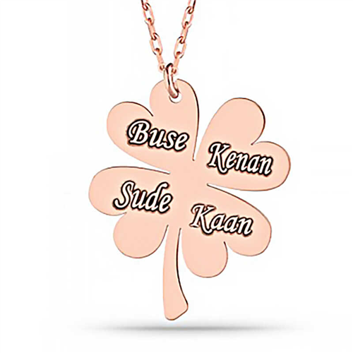 Silver Rose Four Leaf Named Clover Women's Necklace The four-leaf clover is considered a symbol of good luck in all cultures. Each of the four leaves of the clover has a different meaning. The first leaf symbolizes hope, the second symbolizes faith, the third symbolizes love, and the fourth leaf symbolizes luck. You can always carry your luck with you or gift good luck to your loved ones. This specially designed women's necklace model with a four-leaf name clover is made of 925 sterling silver. Let your names come to life on the skin of the woman you love with the silver women's four leaf name clover necklace. This special necklace model with a 45 cm long silver chain will be a very stylish option for young lovers on special occasions. Adorn your loved one's neck with love with this special necklace. The silver women's four leaf name clover necklace has rose plating. Rose plated silver women's necklace models preserve their shine for a long time. This specially designed named necklace will be one of the most beautiful gifts that your loved ones will enjoy wearing. Like all our silver women's necklace models, the silver women's four-leaf clover named necklace is also handmade. Due to silver and precious stones, there may be a ± 10% deviation in the specified product weight. Width: 2.70 cm Length: 3.10 cm Avg. Weight: 3.55 g Chain length: 45 cm