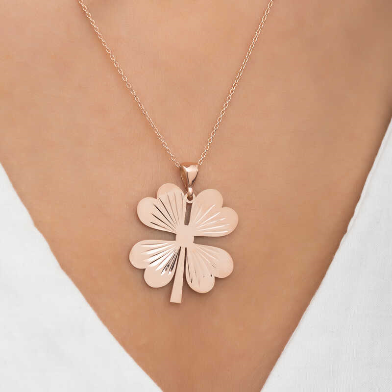 Silver Rose Four Leaf Rose Clover Women's Necklace The four-leaf clover is considered a symbol of good luck in all cultures. Each of the four leaves of the clover has a different meaning. The first leaf symbolizes hope, the second symbolizes faith, the third symbolizes love, and the fourth leaf symbolizes luck. You can carry your luck with you at all times or gift it to your loved ones. This specially designed women's necklace featuring a four-leaf clover is made of 925 sterling silver. Let your names come to life on the skin of the woman you love with the silver women's four-leaf clover necklace. This special necklace with a 45 cm long silver chain will be a very elegant option for young lovers on special occasions. Adorn your loved one's neck with love with this special necklace. The silver women's four-leaf clover necklace has rose plating. Rose-plated silver women's necklaces preserve their shine for a long time. This specially designed named necklace will be one of the most beautiful gifts that not only you but also your loved ones will enjoy wearing. Like all our silver women's necklace models, the silver women's four-leaf clover necklace is also handmade. Due to silver and precious stones, there may be a ± 10% deviation in the specified product weight. Width: 2.60 cm Length: 2.50 cm Average Weight: 4.10 gr. Chain length: 45 cm