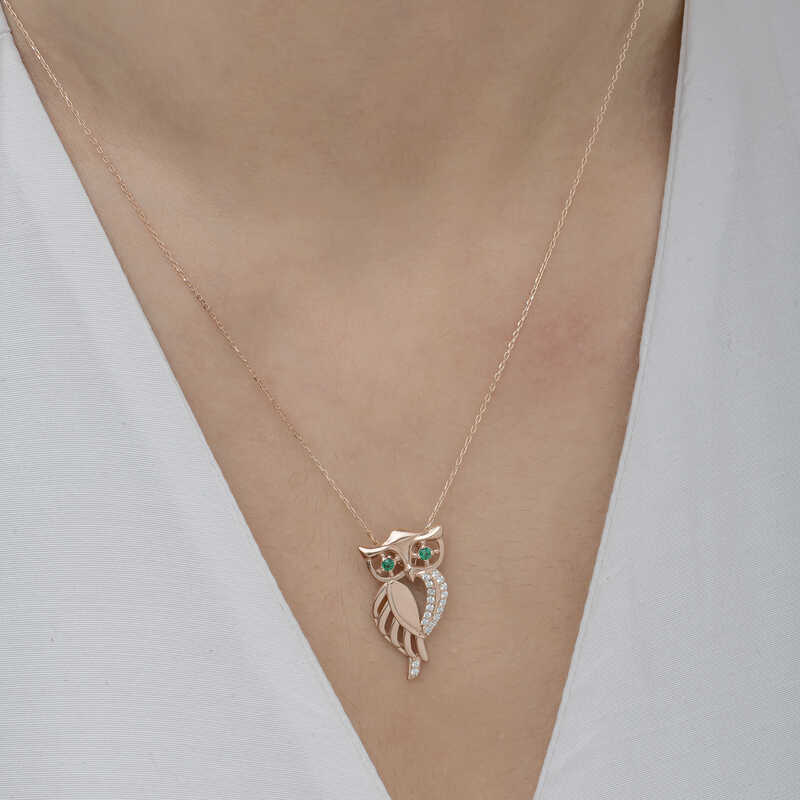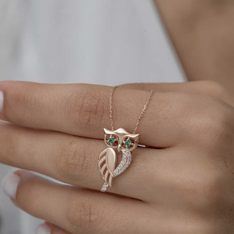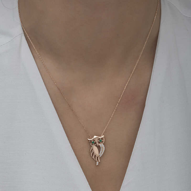 Silver Green-Eyed Owl Women's Necklace The owl is a mythological animal with rich meanings in history and different cultures. The reason why owl accessories are so popular is because they have strong symbolic meanings. Thanks to its ability to see at night, it symbolically represents wisdom due to its strong intuitive powers. You can love this necklace in daily life and gift it to your loved ones on special occasions. This stylish design necklace is made of 925 sterling silver. The silver is rose plated. As with all silver products, the silver green-eyed owl women's necklace is entirely handmade. Due to silver and precious stones, there may be ± 10% deviation from the average product weight. Width: 1.40 cm Length: 2.50 cm Avg. Weight: 2.50 gr. Chain Length: 45 cm