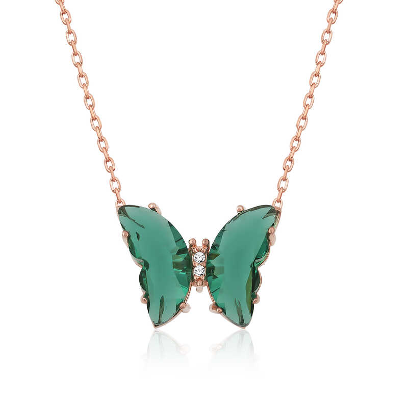 Silver Rose Green Glass Butterfly Necklace Butterfly; is one of the most popular motifs preferred by women. It reminds lovers of the mystery of nature and the richness of human imagination. Symbolizing freedom, innocence, and purity, the spring butterfly is an expression of pure affection and love. A green glass butterfly necklace that you and your loved ones will enjoy wearing will be one of the best gifts for your loved one. The necklace is made of 925 sterling silver. Rose plating is applied to the silver. Rose-plated silver women's necklaces preserve their shine for a long time and delay oxidation. The average silver chain length is 45 cm. Like all silver women's necklaces, the silver green glass butterfly necklace model is also handmade. Due to silver and precious stones, there may be a ± 10% deviation in the average product weight. Width: 1.50 cm Length: 1.20 cm Average Weight: 2.65 gr.