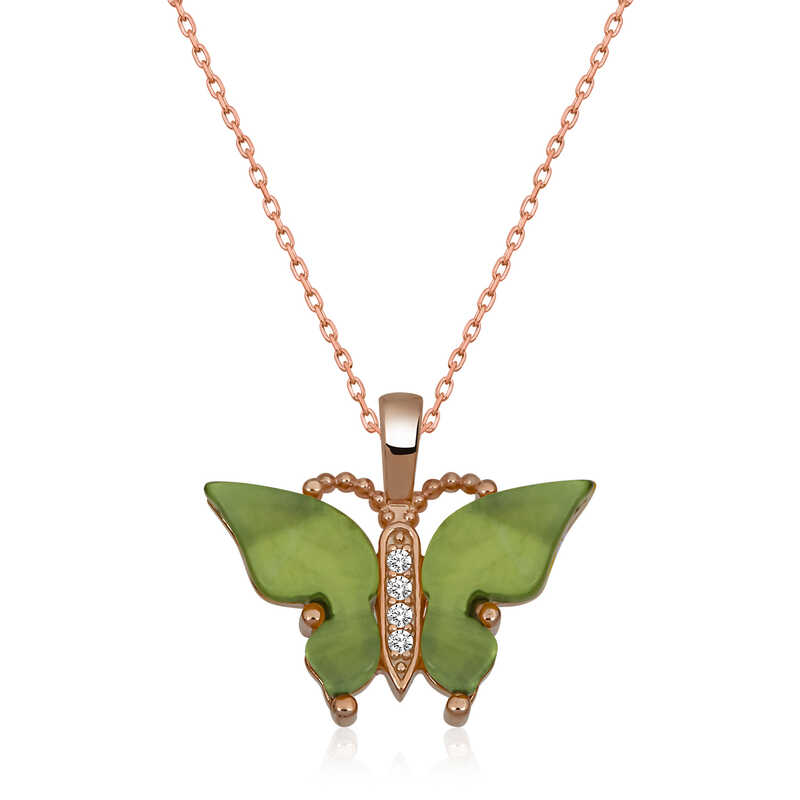 Silver Rose Green Tiger's Eye Stone Butterfly Women's Necklace Tiger's eye, a quartz group stone, is one of the most valuable healing stones. When polished, it gains a silky appearance. Tiger's eye stone is an iridescent stone. It is generally used as jewelry. Tiger's eye stone is known to be good for asthma diseases. It also acts as a relaxant in cases of nervous system disorders and has a relaxing effect. It is a wonderful emotional balancer. The butterfly is one of the most popular motifs preferred by women. It reminds lovers of the mystery of nature and the richness of human imagination. Symbolizing freedom, innocence and purity, butterflies are an expression of pure love and affection. The Green Tiger's Eye Stone butterfly women's necklace, which you and your loved ones will enjoy wearing, will be one of the best gifts for your loved one. The necklace is made of 925 sterling silver. Rose plated silver women's necklaces preserve their shine for a long time and delay oxidation. The average silver chain length is 45 cm. As with all silver women's necklaces, the silver Green Tiger's Eye Stone butterfly women's necklace model is also handmade. Due to silver and precious stones, there may be ± 10% deviation in the average product weight. Width: 1.70 cm Length: 1.50 cm Chain Length: 45 cm Weight: 1.83 gr.