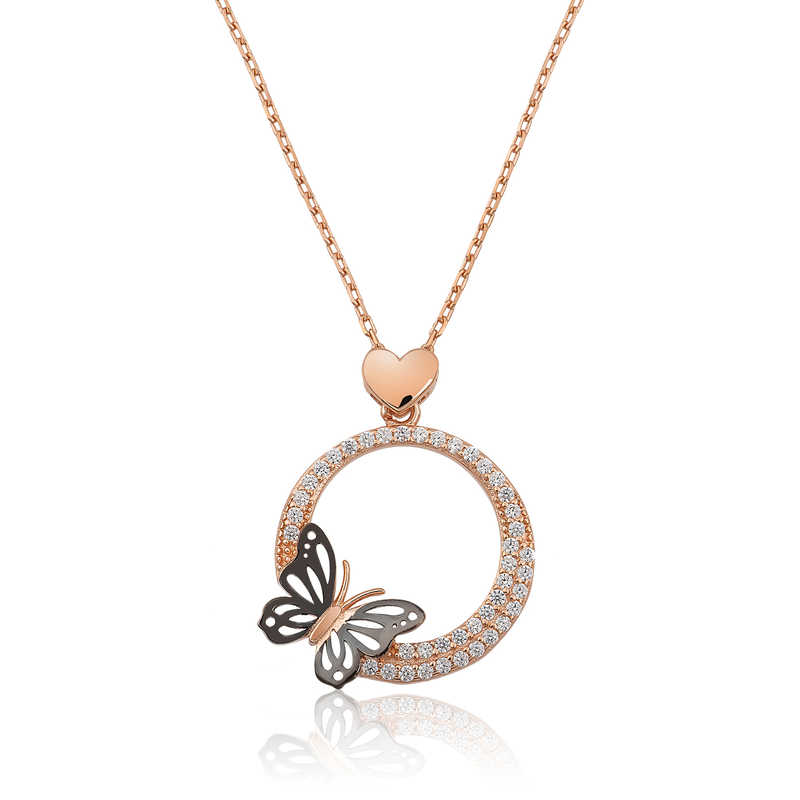 Silver Rose Heart Butterfly Circle Necklace In ancient wisdom, the butterfly is the direct symbol of the soul, symbolizing the freedom, lightness, and elegance of the soul. The butterfly, which also symbolizes rebirth, symbolizes the rebirth in love with the heart necklace. The timeless silver necklace featuring a butterfly and a heart that appeals to all women who want to achieve a stylish look is waiting for you. The silver heart butterfly circle women's necklace is a perfect option for a birthday gift, Valentine's Day gift or as a gift for mothers on special occasions. The heart butterfly circle women's necklace is made of 925 sterling silver. Rose plating is applied on silver. Rose plating women's necklaces preserve their shine for a long time, turns silver to a pink color and delays oxidation. The stones on it are zircon. Like all women's necklaces, the silver heart butterfly circle necklace is also handmade. Due to silver and precious stones, there may be ± 10% deviation in the average product weight. Width: 1.70 cm Length: 2.30 cm Average Weight: 2.66 gr. Chain Length: 45 cm