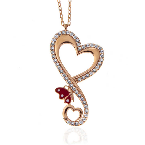 Silver Rose Heart Butterfly Women's Necklace Symbolizing freedom, innocence, and purity, butterflies are the expression of pure love and affection. The spring butterfly necklace symbolizes how love begins with a small spark, then grows with great patience, and finally, a declaration of love. This silver heart butterfly necklace will be one of the most beautiful gifts that both you and your loved ones will enjoy wearing. Rose plating is made on silver. Rose-plated silver women's necklaces preserve their shine for a long time, turn the silver to a pink color, and delay oxidation. Like all silver women's necklaces, the silver heart butterfly women's necklace is hand-crafted. Due to silver and precious stones, there may be ± 10% deviation in the specified product weight. Necklace Width: 1.60 cm Necklace Length: 3.00 cm Chain Length: 45 cm Average Weight: 2.70 gr.