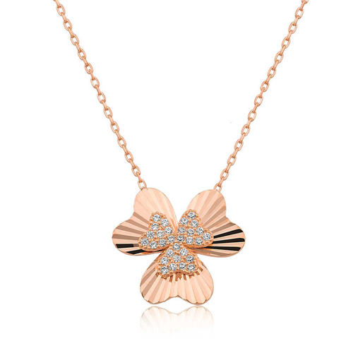 Silver Rose Heart Clover Women's Necklace The clover is considered a symbol of good luck in all cultures. Each leaf of the clover has a different meaning. The first leaf symbolizes hope, the second symbolizes faith, the third symbolizes love, and the fourth leaf symbolizes luck. This specially designed women's necklace model featuring a heart-patterned clover is made of 925 sterling silver. The silver heart clover women's necklace model has a 45 cm long silver chain. This elegant necklace will be a very stylish option for young lovers on special occasions. Adorn your loved one's neck with love with this special necklace. The silver heart clover women's necklace model is rose gold plated. Rose gold plated silver women's necklace models preserve their shine for a long time. The silver heart clover women's necklace will be one of the most beautiful gifts that not only you but also your loved ones will enjoy wearing. Like all our silver women's necklace models, the silver heart clover women's necklace is handmade. Due to silver and precious stones, there may be a ± 10% deviation in the average product weight. Width: 1.70 cm Length: 1.50 cm Average Weight: 2.32 gr.