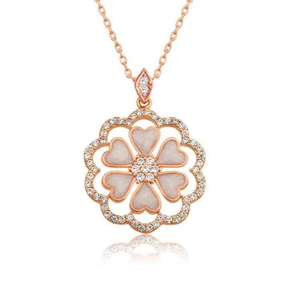 Silver Rose Heart Flower Women's Necklace A stylish flower patterned silver necklace model consisting of heart-shaped leaves is a nice accessory that you can enjoy using and gifting to your loved ones. The specially designed women's necklace model consisting of heart-shaped leaves and flowers is made of 925 sterling silver. This elegant necklace will be a very stylish option for young lovers on special occasions. Adorn your loved one's neck with love with this special necklace. The silver heart flower women's necklace model is rose gold plated and white mother-of-pearl enamel. Rose gold-plated silver women's necklace models preserve their shine for a long time. The silver heart flower women's necklace will be one of the most beautiful gifts that your loved ones will enjoy wearing as much as you. Like all our silver women's necklace models, the silver heart flower women's necklace is handmade. Due to silver and precious stones, there may be a ± 10% deviation in the average product weight. Width: 2.00 cm Length: 2.0 cm Average Weight: 2.79 gr.