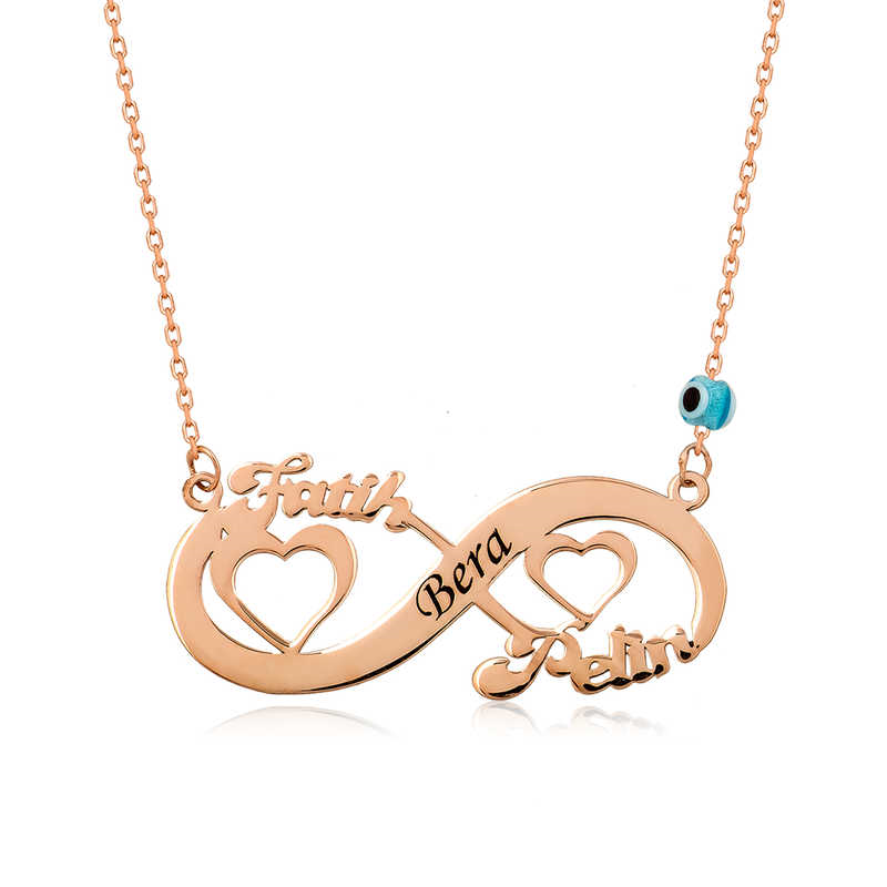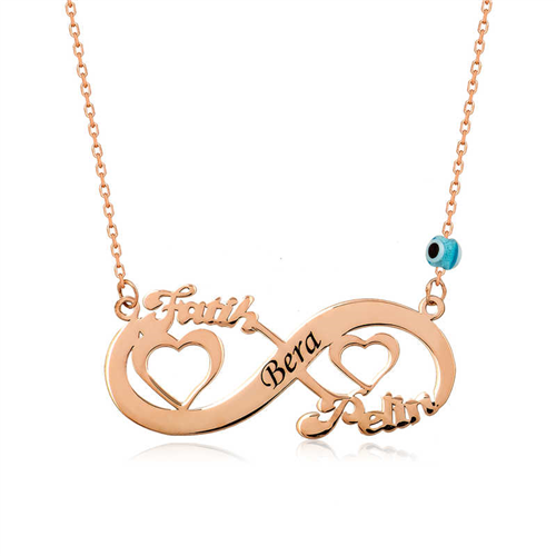 Silver Rose Heart Infinity Name Necklace One of the most beautiful and meaningful ways to express eternal love to your loved one is to gift her infinity-themed silver jewelry. With this special necklace that you will gift to your loved one, you can express your eternal love for her and give the message that you will be together forever. Infinite love women's necklace model is made of 925 sterling silver. Rose gold plated on silver. Rose gold plated silver women's necklaces preserve their shine for a long time and oxidation is delayed. The average length of the silver chain is 45 cm. Like all silver women's necklace models, the silver heart infinity necklace model is also produced by hand. Due to silver and precious stones, there may be ± 10% deviation in the average product weight. Note: Please specify the name you want to be written in the notes section. Width: 3.80 cm Height: 1.50 cm Average Weight: 2.80 gr.