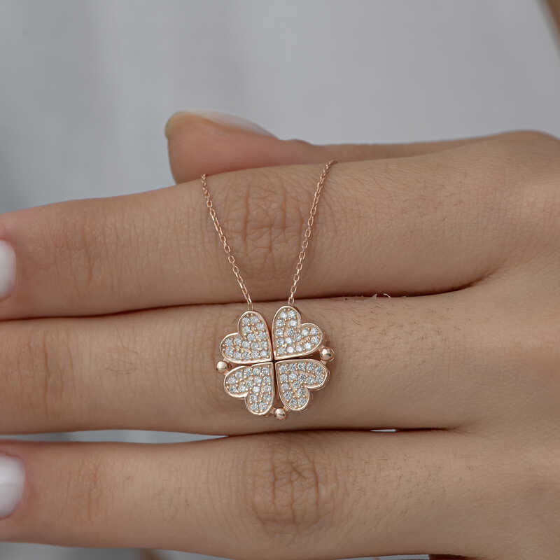 Silver Rose Heart Openable Clover Women's Necklace The four-leaf clover is considered a symbol of good luck in all cultures. The first leaf symbolizes hope, the second faith, the third love, and the fourth leaf luck. This fourth leaf is very rare in nature. The white heart openable clover women's necklace adorned with silver and white zircon stones is a wonderful model that you can enjoy using and gifting to your loved ones. Silver and white stone women's necklace is made of 925 sterling silver. Rose plating is used on the silver necklace. Rose-plated silver women's necklaces preserve their shine for a long time and oxidation is delayed. The average silver chain length is 45 cm. As with all our silver women's necklace models, the silver heart-shaped clover women's necklace is also handmade. You can use it in 2 different ways. Due to silver and precious stones, there may be ± 10% deviation in product weight. Width: 1.70 cm. Length: 1.50 cm. Weight: 3.50 gr.