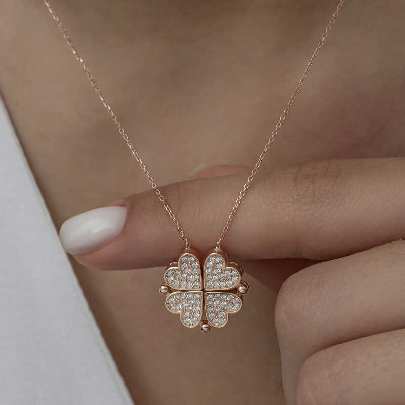 Silver Rose Heart Openable Clover Women's Necklace The four-leaf clover is considered a symbol of good luck in all cultures. The first leaf symbolizes hope, the second faith, the third love, and the fourth leaf luck. This fourth leaf is very rare in nature. The white heart openable clover women's necklace adorned with silver and white zircon stones is a wonderful model that you can enjoy using and gifting to your loved ones. Silver and white stone women's necklace is made of 925 sterling silver. Rose plating is used on the silver necklace. Rose-plated silver women's necklaces preserve their shine for a long time and oxidation is delayed. The average silver chain length is 45 cm. As with all our silver women's necklace models, the silver heart-shaped clover women's necklace is also handmade. You can use it in 2 different ways. Due to silver and precious stones, there may be ± 10% deviation in product weight. Width: 1.70 cm. Length: 1.50 cm. Weight: 3.50 gr.