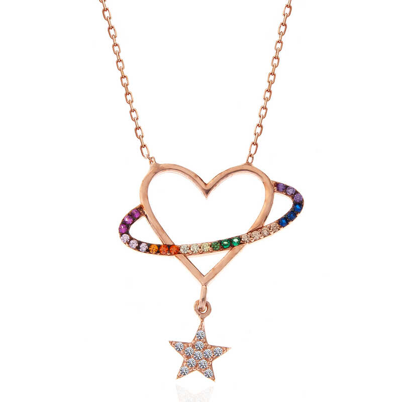 Silver Rose Heart Star Women's Necklace The heart symbol has always been the symbol of unconditional love and passion. In religious teachings, the power of the heart is limitless. Because the heart is the house of the Creator and our gateway to reality that opens to the universe. This stylish silver heart necklace is a perfect option for a birthday gift, Valentine's Day gift or a gift for mothers on special occasions. The silver heart women's necklace is made of 925 sterling silver. This necklace is rose plated. Rose plated silver women's necklace models preserve their shine for a long time. The stones on it are zircon. Like all our silver women's necklace models, the silver heart women's necklace model is produced by hand. Due to silver and precious stones, there may be ± 10% deviation in the average product weight. Width: 2.30 cm Length: 2.80 cm Avg. Weight: 2.40 gr. Chain Length: 45 cm