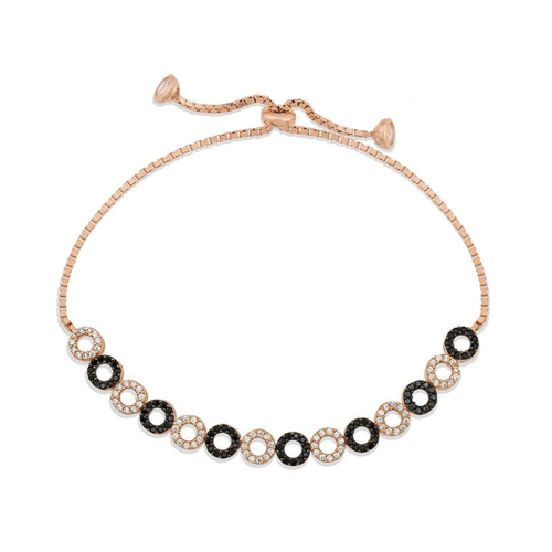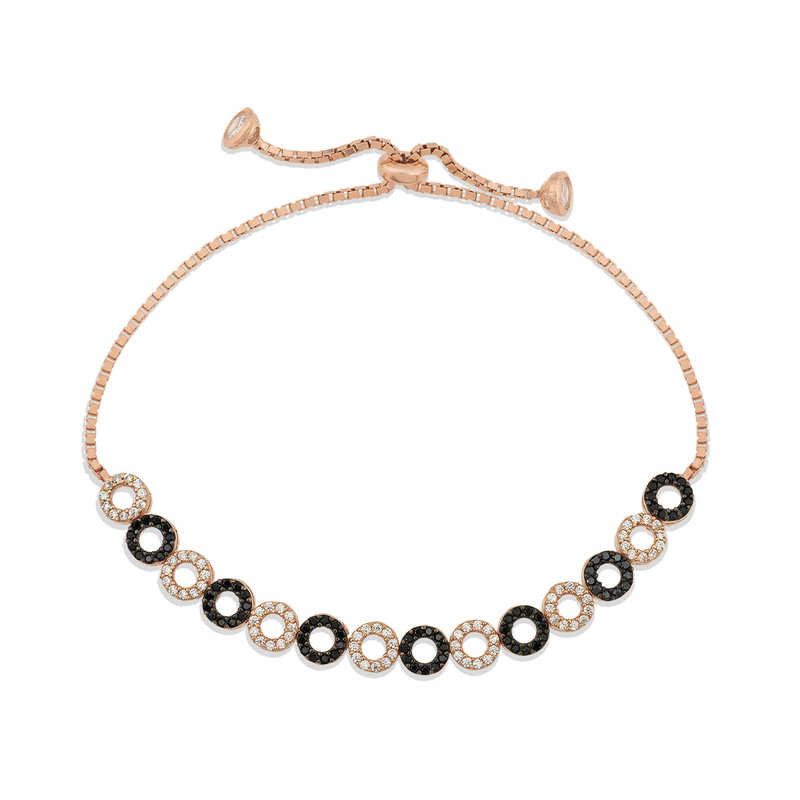 Silver Rose Black and White Stone Hoop Elevator BraceletAn ideal option for women who love a chic and fantasy look. In the collections; for women who pursue showiness and elegance, the black and white stone hoop elevator bracelet is waiting for you with a model suitable for every taste and concept. The black and white stone hoop elevator women's bracelet model is made of 925 sterling silver. Rose plated silver. Rose plated hoop elevator women's bracelet models preserve their shine for a long time. Thanks to its elevator structure, it adapts to every wrist size. Like all silver women's bracelet models, the silver black and white stone hoop elevator women's bracelet model is also produced by hand. Due to silver and precious stones, there may be a ± 10% deviation in the average product weight.Width: 0.50 cm Length: 8.00 cm Average Weight: 7.79 gr.