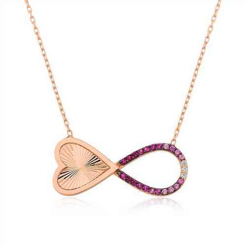 Silver Rose Infinity Heart Women's Necklace One of the best ways to express eternal love is to gift silver jewelry with an infinity symbol to your loved one. The infinity symbol can be one of the meaningful gifts that can be received on special occasions such as wedding anniversaries or Valentine's Day as a symbol of eternal love and loyalty. The infinite heart women's necklace is made of 925 sterling silver. Rose plated silver. Rose plated silver women's necklace models preserve their shine for a long time and oxidation is delayed. The stones on the necklace are zircon. The silver infinity heart women's necklace is entirely handmade. The stones on the necklace are zircon. Like all women's silver necklace models, the silver infinity heart women's necklace is also handmade. Due to silver and precious stones, there may be a ± 10% deviation in the specified product weight. Width: 2.50 cm Length: 1.00 cm Average Weight: 2.28 Gr. Chain Length: 45 cm