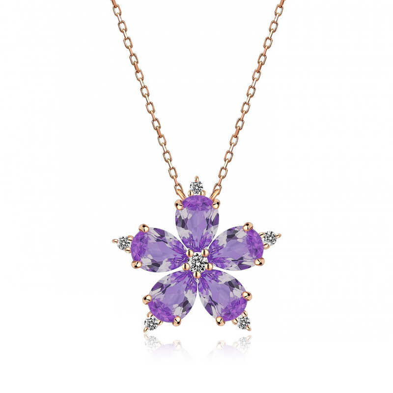 Silver Rose Lilac Camellia Flower Necklace Let the sparkle of the necklace inspired by the fascinating camellia flower embrace you. The camellia flower necklace made of sparkling stones is a perfect option for a birthday gift, Valentine's Day gift or for special occasions. The silver lilac camellia flower women's necklace is made of 925 sterling silver. This necklace has rose plating. Rose-plated silver women's necklace models preserve their shine for a long time. As with all our silver women's necklace models, the silver lilac camellia flower women's necklace is also handmade. Due to silver and precious stones, there may be ± 10% deviation in the average product weight. Width: 1.60 cm Length: 1.60 cm Average Weight: 3.35 gr. Chain Length: 45.00 cm