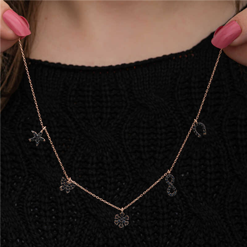 Silver Rose Luck Necklace for Women One of the most elegant models you can buy to bring luck to your loved ones is the silver luck necklace. This model, which you can easily use in daily life with its simple design, is made of 925 sterling silver. Rose plated silver. Rose plated silver luck necklace models preserve their shine for a long time and oxidation is delayed. All stones on the necklace are zircon. The average silver chain length is 45 cm. Like all silver women's necklace models, the silver luck necklace model is also handmade. Due to silver and precious stones, there may be a ± 10% deviation from the average product weight. Note: There may be changes in the lucky beads on the necklace. Width: 0.90 cm Length: 0.80 cm Chain Length: 45 cm Average weight: 2.60 gr