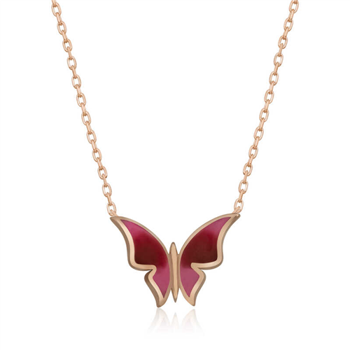 Silver Rose Minimal Butterfly Women's Necklace Butterflies, symbolizing freedom, innocence, and purity, are the expression of pure love and affection. The spring butterfly necklace symbolizes how love begins with a small spark, then grows with great patience, and finally, a declaration of love. A minimal butterfly women's necklace that you and your loved ones will enjoy wearing will be one of the most beautiful gifts. The necklace is made of 925 sterling silver. Rose plating is applied to the silver. Rose-plated silver women's necklaces preserve their shine for a long time and delay oxidation. The colors on the necklace are enamel work. The average silver chain length is 45 cm. Like all silver women's necklaces, the silver minimal butterfly women's necklace is also handmade. Due to silver and precious stones, there may be a ± 10% deviation in the specified product weight. Width: 1.40 cm Length: 1.10 cm Average Weight: 1.60 gr.